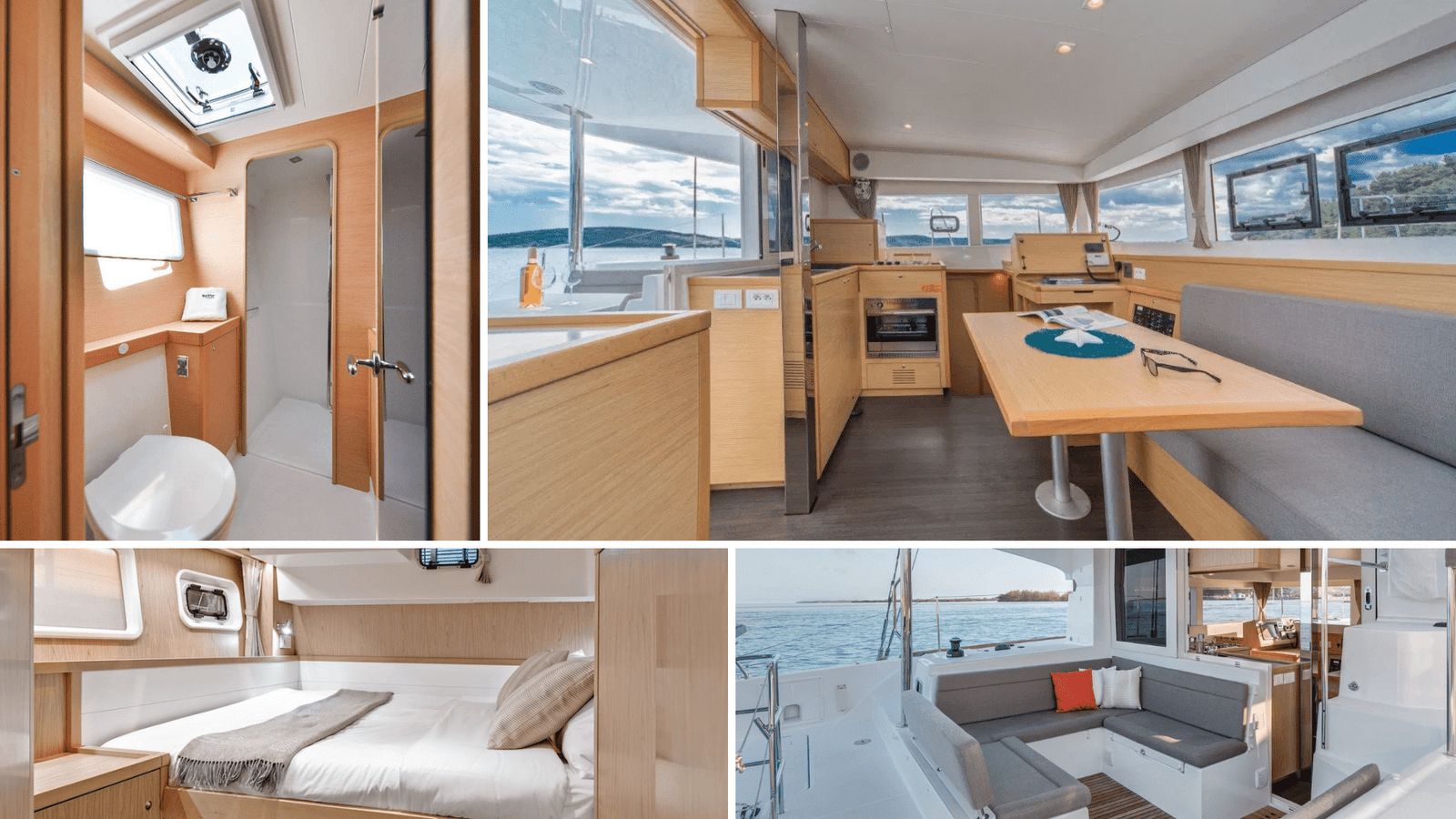 Velký salon s kuchyní a navigačním koutem je umístěný uprostřed katamaránu. S venkovním posezením je spojený posuvnými dveřmi a celý prostor je krásně prosklený. Pokud venku hodně fouká, salon je úžasné místo, kde se dá schovat a přitom se kochat výhledem. Na palubě najdeš také 220V zásuvky, které jsou v provozu v přístavu, a autozásuvky, které fungují po celou dobu plavby a zvládnou nabít telefony, notebooky a podobná zařízení. Audiosystém je rozmístěný po lodi a stačí se k němu připojit pomocí 3,5mm jacku.