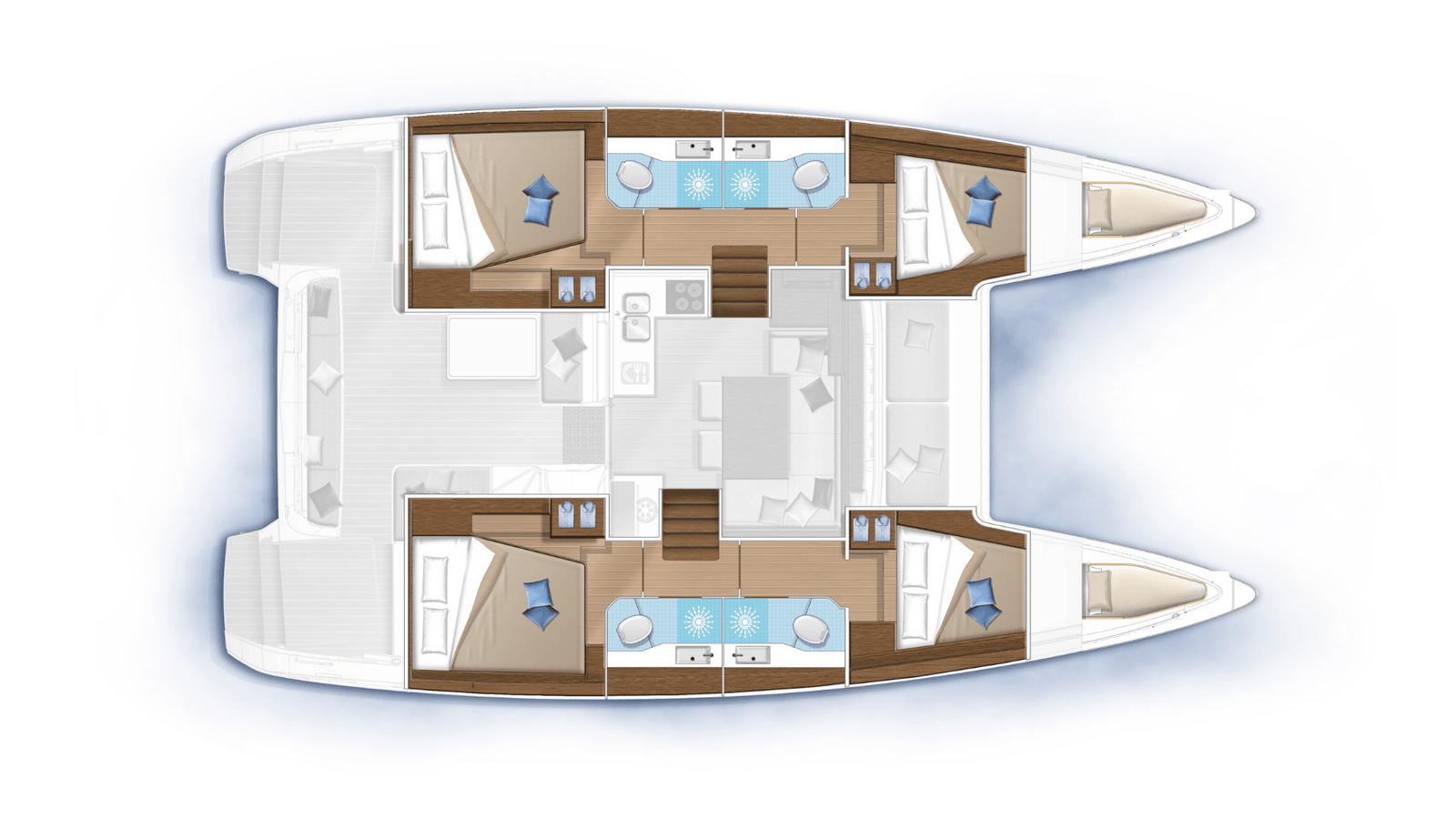 Naše plavby na katamaránu jsou určeny pro 8 lidí plus kapitána. Katamarány mají čtyři kajuty s dvojlůžkem a dvě kajuty s jednolůžkem v přídi. Každá kajuta je vybavena polštářem, peřinou, povlečením, prostěradlem a ručníkem. Kapitán tradičně spává v kajutě na přídi, takže budete mít dostatek prostoru pro sebe.
