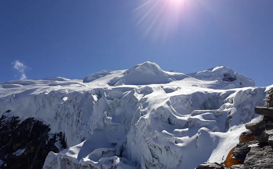 Balíme jen to nejnutnější. Stoupáme po ledovci Mera La. Cesta je technicky snadná, ale v té výšce lapáš po dechu. High Camp je orlí hnízdo přilepené na skále. Sherpové postaví stany, uvaří polévku. Ty zalezeš do spacáku a snažíš se usnout. Výhled ze stanu? Everest, Makalu, Lhotse. Brutalita.